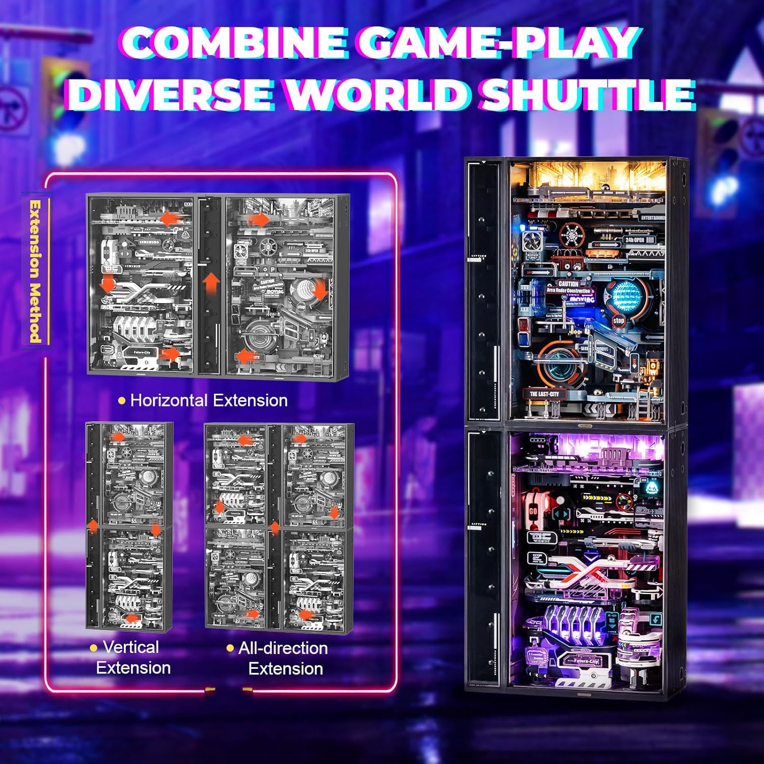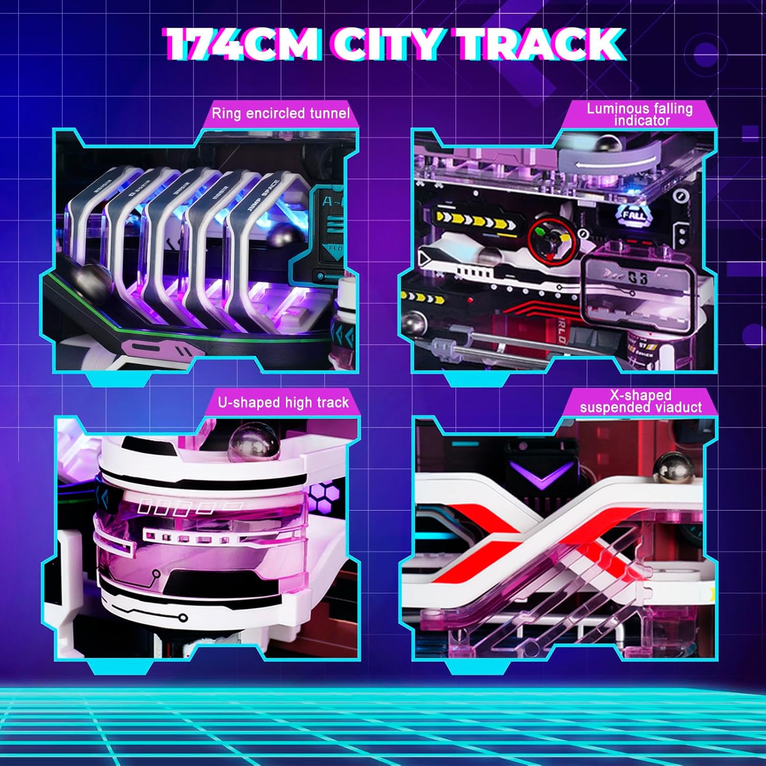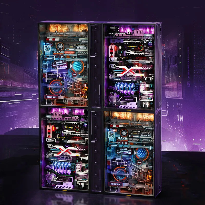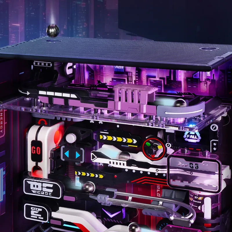Dies ist ein Miniaturhaus-3D-Puzzle-Kugelbahnmodell im Cyberpunk-Stil mit einer Gesamtlänge von ca. 174 cm. Werden die Kugeln in das Loch geworfen, rollen sie durch die Stadt von oben nach unten, dann mit dem Aufzug wieder nach oben und wiederholen den Vorgang.